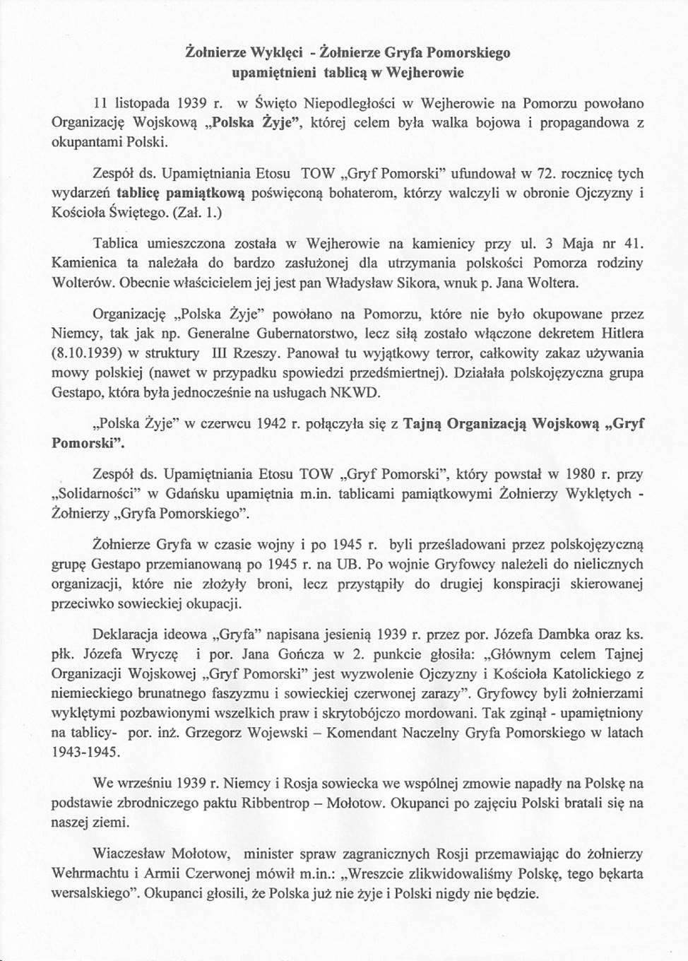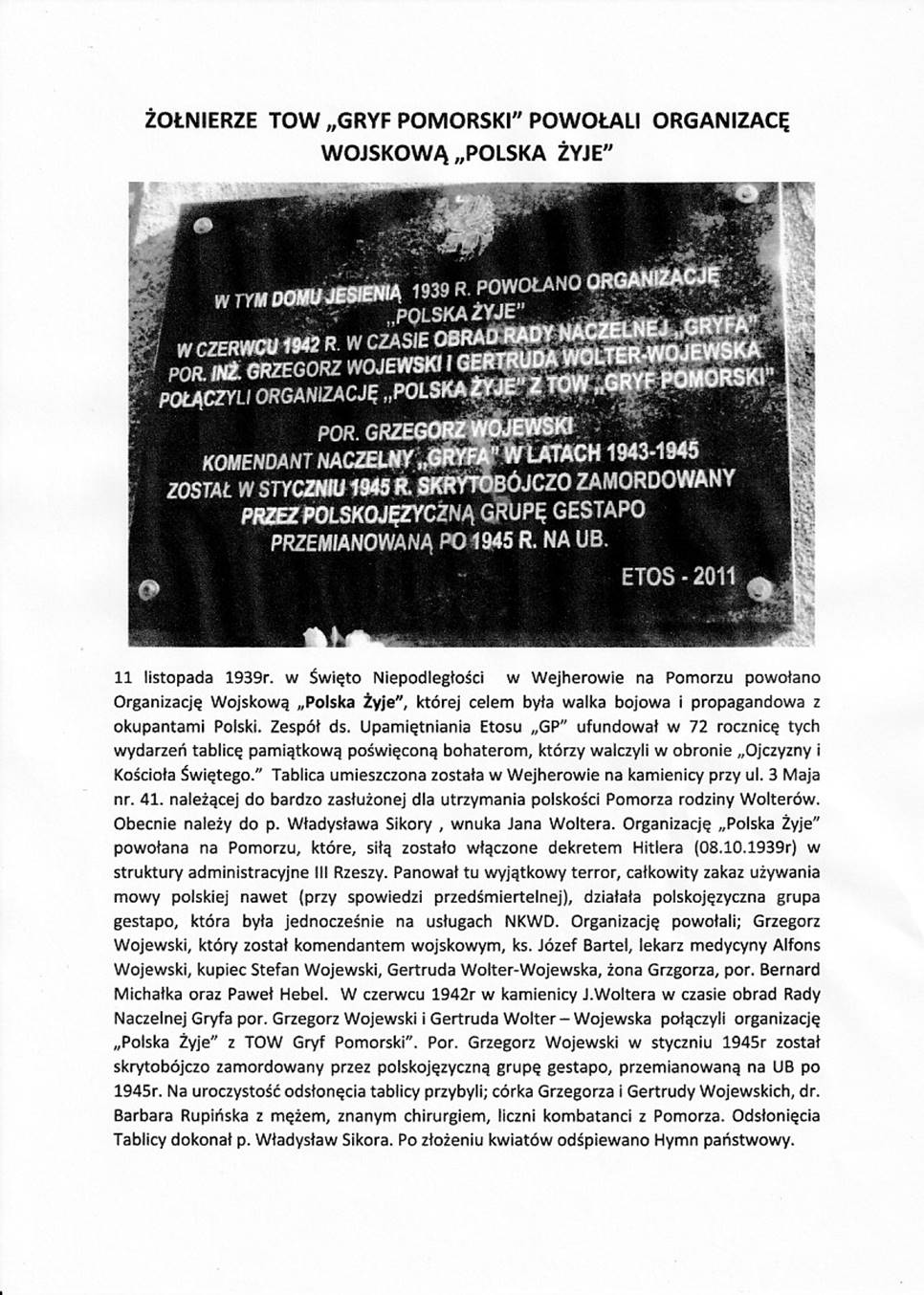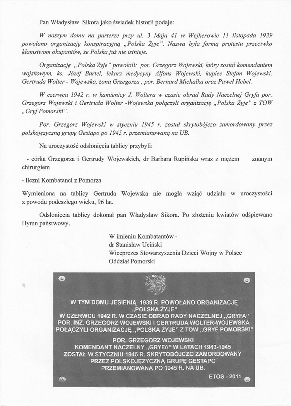Tablica umieszczona jest w Wejherowie na kamienicy przy ulicy 3 Maja nr.4 Kamienica należała do rodziny Wolterów, bardzo zasłużonej dla utrzymania polskości Pomorza. Obecnym jej właścicielem jest Pan Władysław Sikora. / Na zdjęciu od lewej Panowie Edmund Hulsz w środku Władysław Sikora oraz Założyciel „ETOSU” dr. Stanisław Uciński/